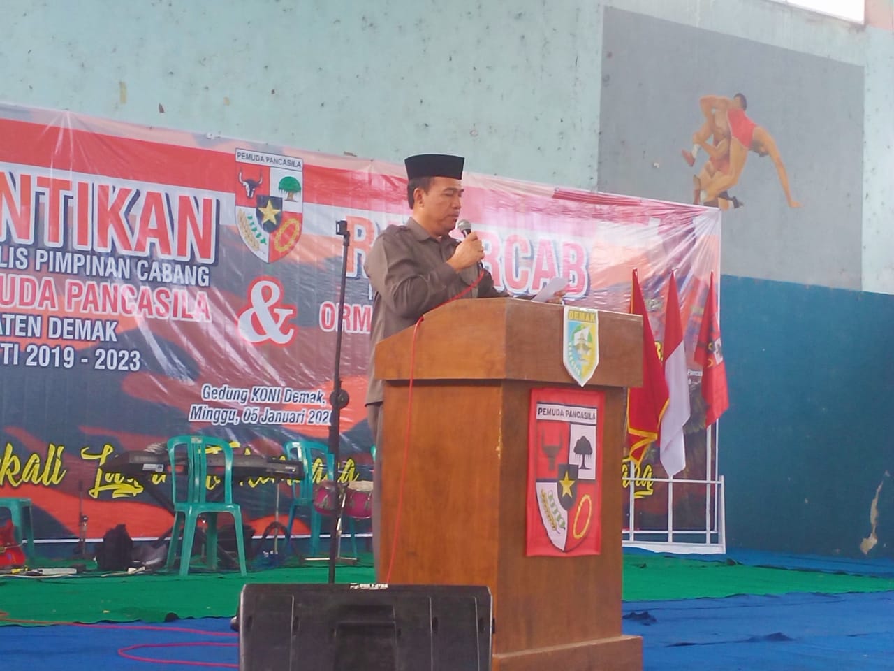 Inti sambutan Agus Herawan.S.Ip.MM (Kakesbangpol Kab.Demak mewakili Bupati) “Saya ucapkan selamat kepada Pengurus Majelis Pimpinan Cabang (MPC) Ormas Pemuda Pancasila Kabupaten Demak Tahun 2019 yang baru saja dilantik. Semoga dengan pelantikan ini akan membawa Pemuda Pancasila di Kabupaten Demak semakin eksis di tengah masyarakat dan dapat bersinergi dengan segenap lapisan masyarakat dalam keutuhan NKRI”.