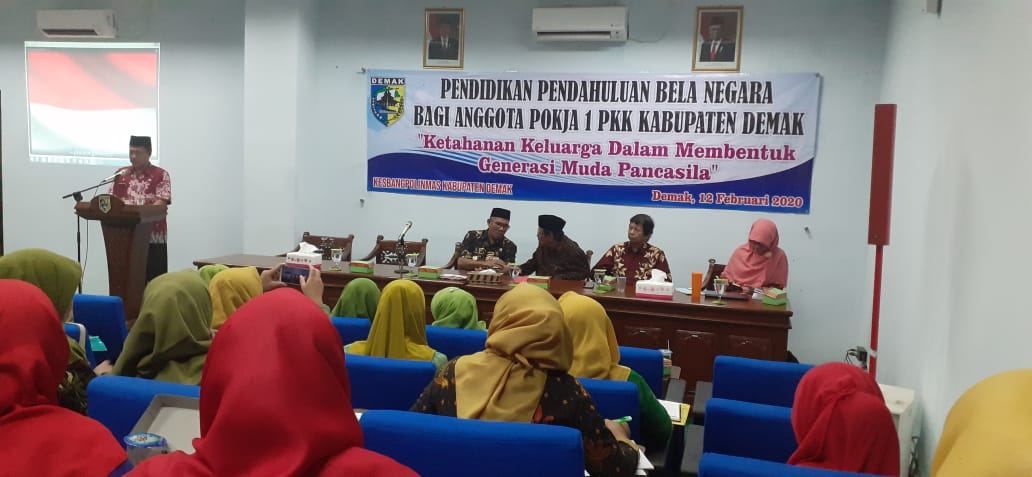 Kesbangpolnmas telah menyelenggarakan Kegiatan Pendidikan Pendahuluan Bela Negara Bagi Anggota Pokja 1 PKK Kab Demak dengan tema Ketahanan Keluarga Dalam Membentuk Generasi Muda Pancasila, yang bertempat di ruang waki Bupati Demak Pada hari, Rabu 12 Februari 2020.