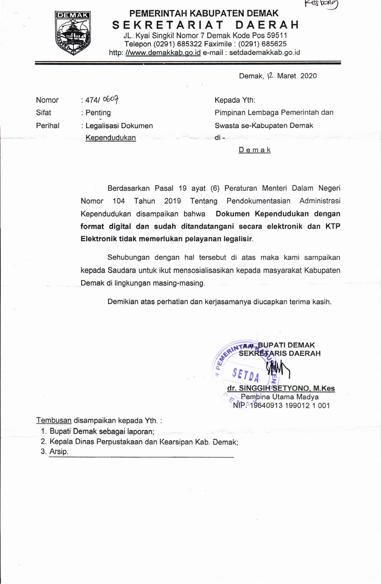 Gambar diatas adalah surat yang menjelaskan dokumen kependudukan dengan format digital dan sudah ditandatangani secara elektronik dan KTP-el tidak memerlukan pelayanan legalisir.