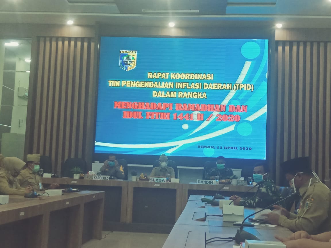 Demak – Dalam rangka persiapan menghadapi Bulan Suci Ramadhan Pemkab Demak melaksanakan Rapat Koordinasi Tim Pengendali Inflasi Daerah (TPID) di Ruang Rapat BinaPraja, Senin 13/04/2020.
