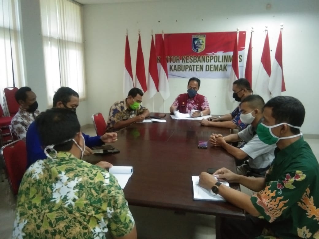 Demak – Rapat tim pemantauan perkembangan politik daerah Berkoodinasi dengan Kantor Kesbangpolinmas khususnya di Wilayah Kabupaten Demak, bertempat di Ruang Rapat Kantor Kesbangpolinmas Demak, 20 Mei 2020.