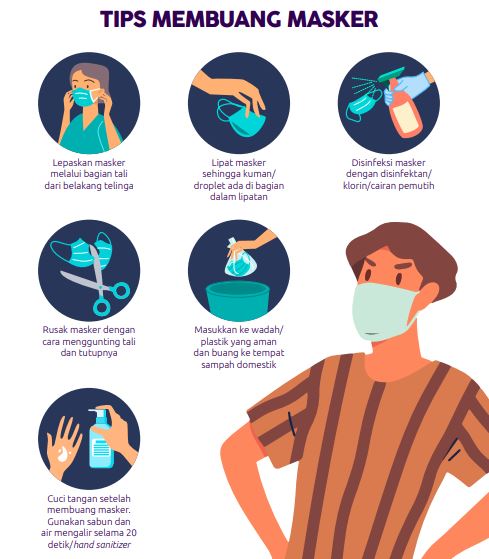 Segera buang masker di tempat sampah tertutup setelah digunakan. Setelah itu, bersihkan tangan setelah menyentuh atau membuang masker tersebut.