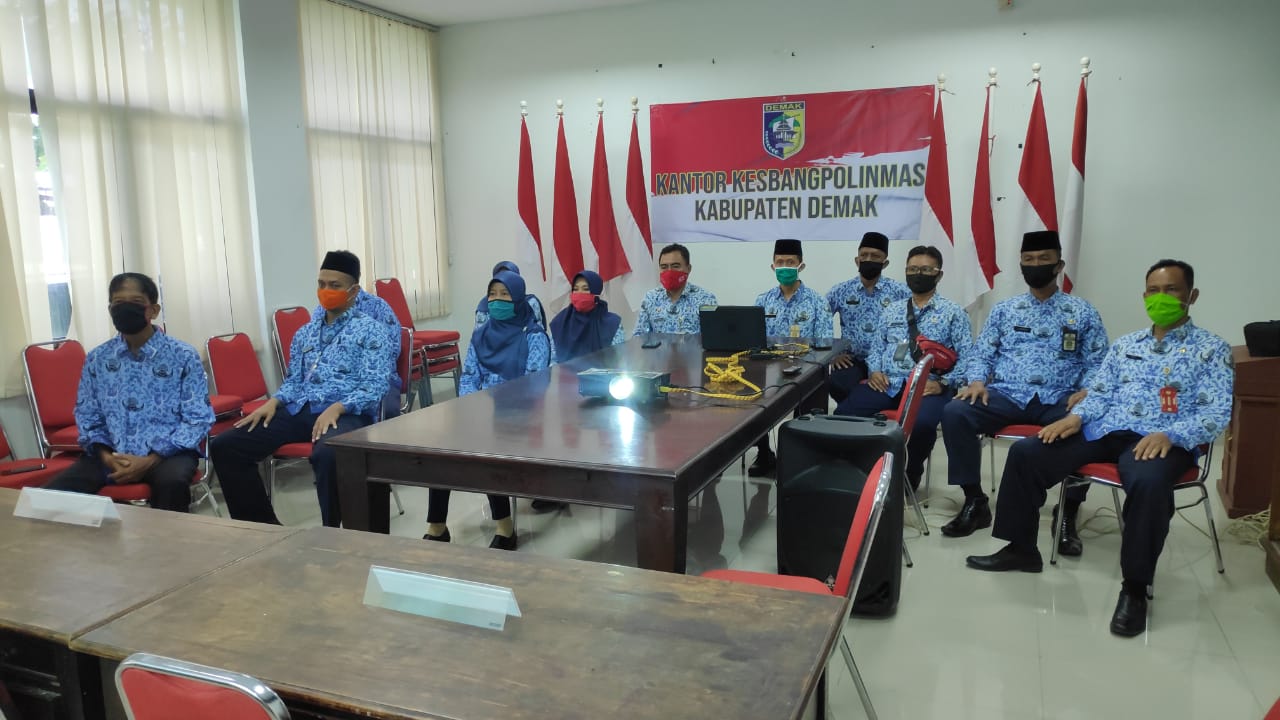 Kantor Kesbangpolinma Kab. Demak mengikuti Upacara melalui Live Streaming yang bertempat di Ruang Rapat Kantor Kesbangpolinmas, yag dihadiri seluruh Kasi dan Staf.