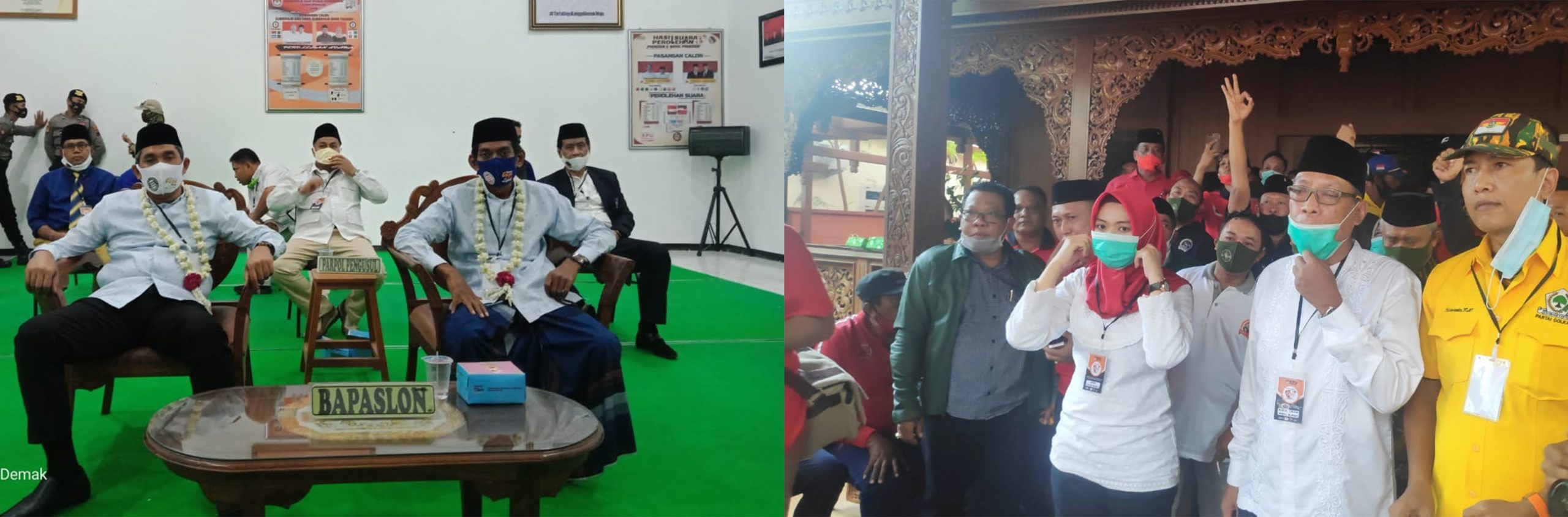 Kedatangan pasangan calon bupati (Mugi-Hebad) dan (Esti-Jos) diterima Ketua KPU, Turut hadir memantau kegiatan, Ketua Bawaslu Kabupaten Demak, Khoirul Saleh. Proses pendaftaran ditandai dengan penyerahan berkas pasangan cabup-cawabup oleh Maskuri kepada KPU.