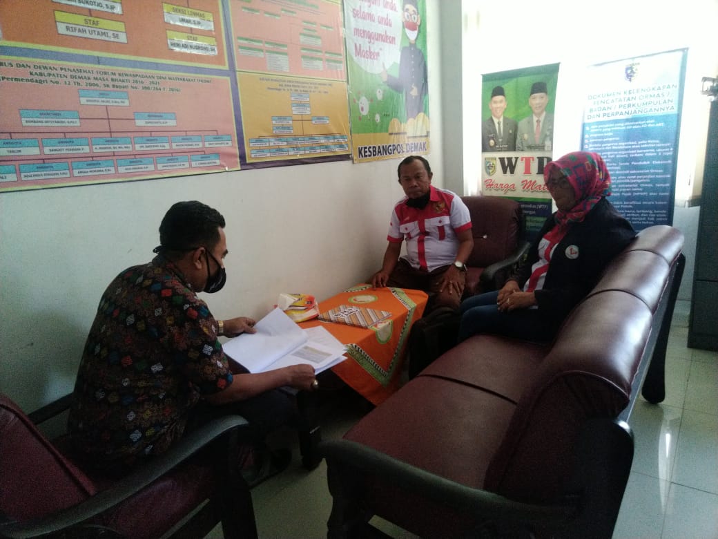 Selasa 22 Spetember 2020, Kantor Kesbangpolinmas melayani Tamu konsultasi untuk pengajuan Surat Pemberitahuan Keberadaan Ormas Gerakan Rakyat Cinta Indonesia DPC Demak.
