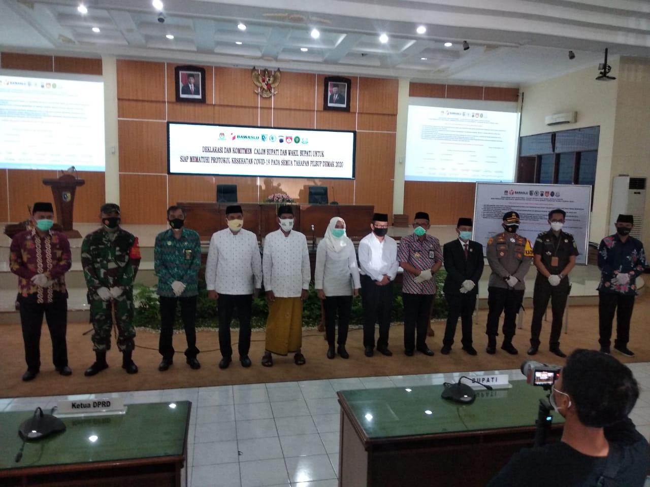 Pukul 10.15 acara rapat pleno terbuka pengundian nomor urut pasangan calon Bupati dan Wakil Bupati wakil dalam pemilihan Bupati dan Wakil Bupati Demak tahun 2020 selesai dilanjutkan Deklarasi dan Komitmen Calon Bupati dan Wakil Bupati Demak untuk siap mematuhi protokol kesehatan Covid-19 pada semua tahapan Pilbup Demak 2020 yang diikuti lk.30.