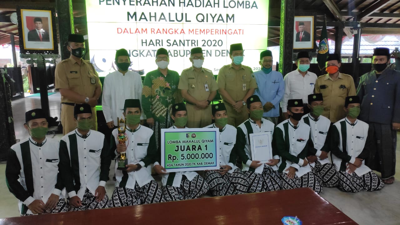 Dalam rangka memperingati Hari Santri 2020 Kesbangpol Kabupaten Demak telah melaksanakan penyerhahan hadiah lomba Mahalul Qiyam yang langsung diberikan langsung oleh Bupati Demak HM. Natsir pada hari Senin 16 November 2020 pukul 13.00 s/d selesai bertempat di Pendopo Pemerintah Kabupaten Demak.