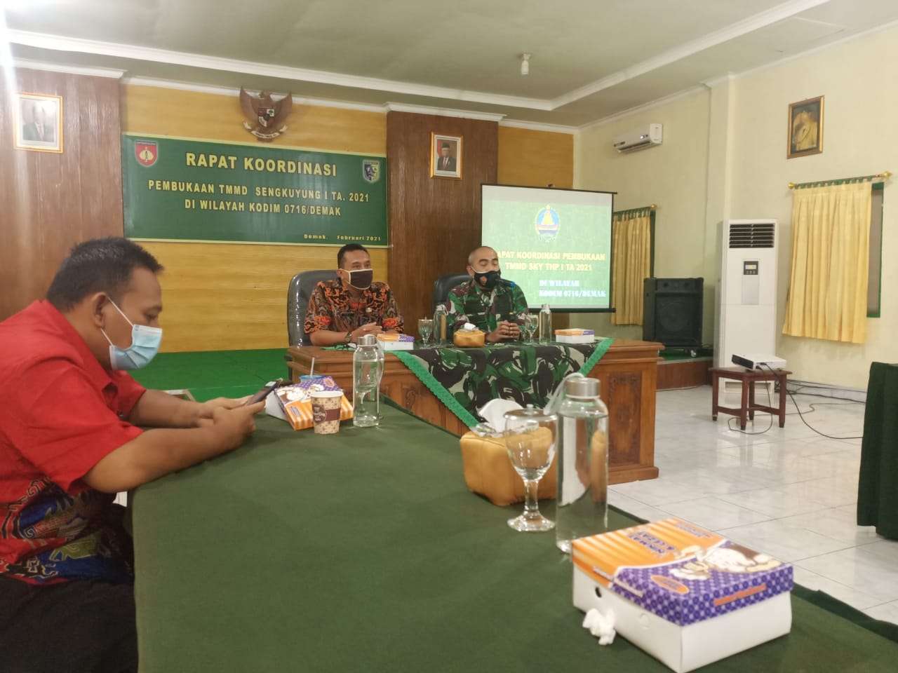 Pada hari kamis, 25 Februari 2021, mulai pukul 09.00 wib – 10.51 wib, bertempat di Aula Makodim 0716 Demak, telah berlangsung giat Rakor pelaksanaan TMMD Sengkuyung I TA. 2021.