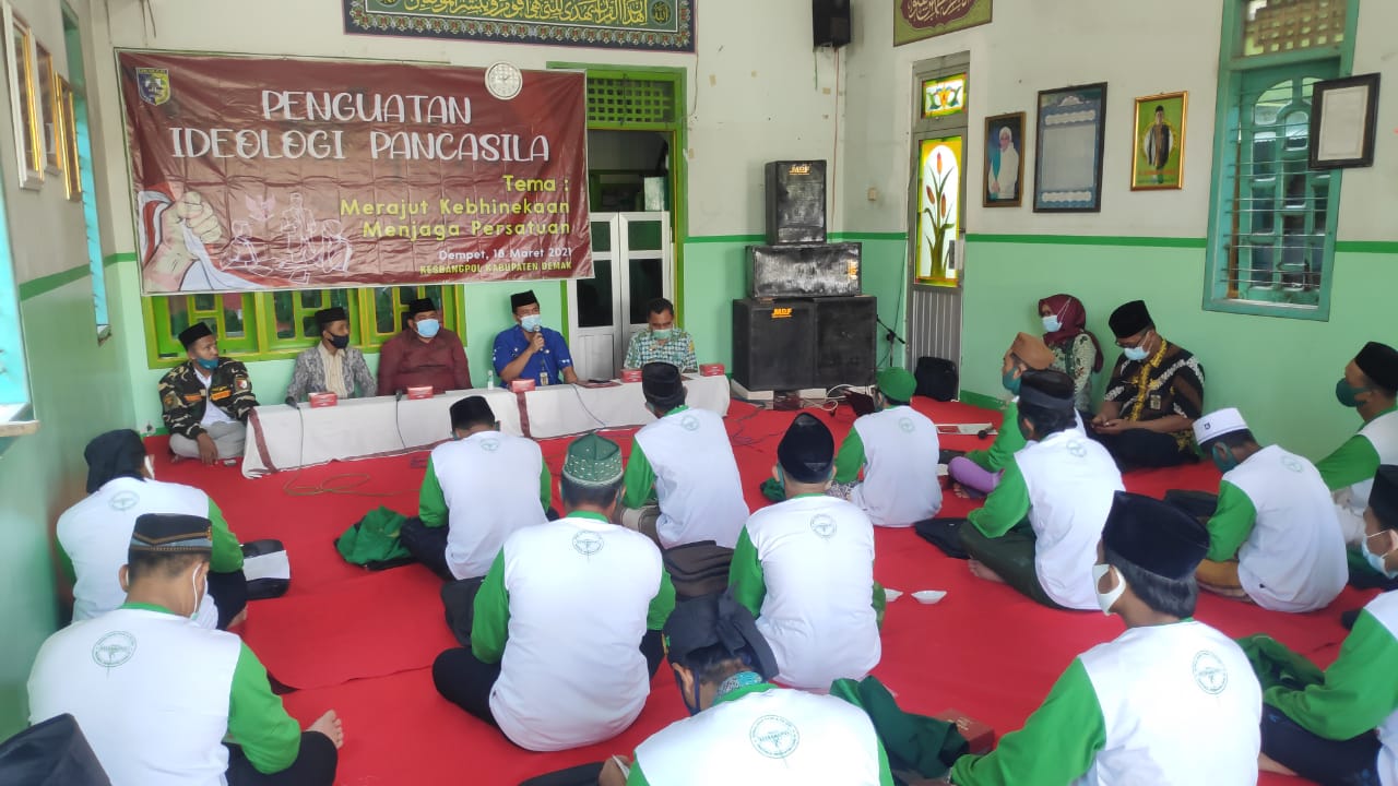 Inti sambutan Bapak Agus Herawan, S.IP., MM. (kepala kantor kesbangpol demak) “Kegiatan penguatan ideologi pancasila sangat dibutuhkan untuk terwujudnya keutuhan bangsa Indonesia. Ditengah pandemi seperti ini sangat rawan terjadinya perpecahan bangsa dari serangan isu hoax yang mengandung unsur SARA didalamnya”.