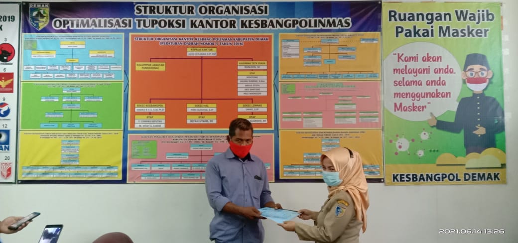 DEMAK – Senin 14 Juni 2021, Kesbangpol Kabupaten Demak melakukan Penyerahan permohonan pendaftaran lembaga pemberdayaan masyarakat “INDEPENDEN LESTARI” yang bertempat di Ruang Tamu Kesbangpol Kabupaten Demak.
