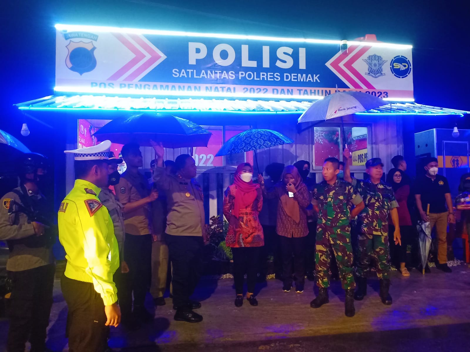 Pada pukul 19.00 wib, di bawah guyur hujan yang lebat, Forkopimda bersama PLT Kepala Dinas terkait transit di Pos Pelayananan (Posyan) Alun – Alun, untuk persiapan melakukan monitoring ke Gereja yang melaksanakan Misa dan Ibadah Natal di malam 24/12/22.