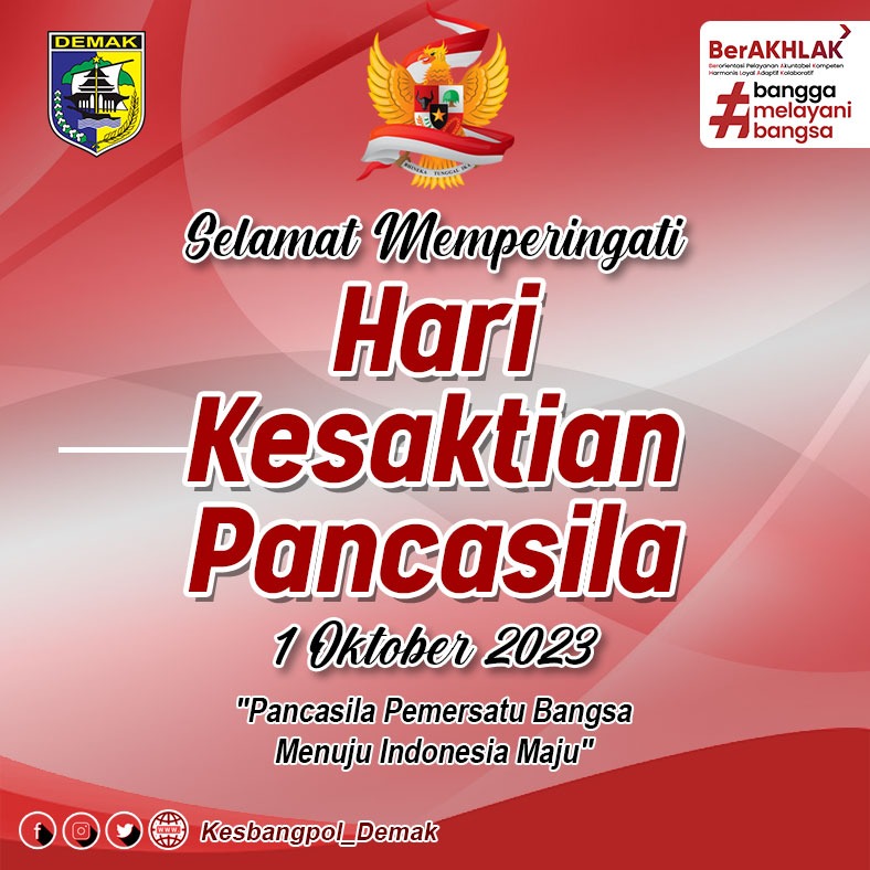 Demak – Minggu 1 Oktober 2023, Badan Kesatuan Bangsa dan Politik Kabupaten Demak mengucapkan selamat memperingati Hari Kesaktian Pancasila.