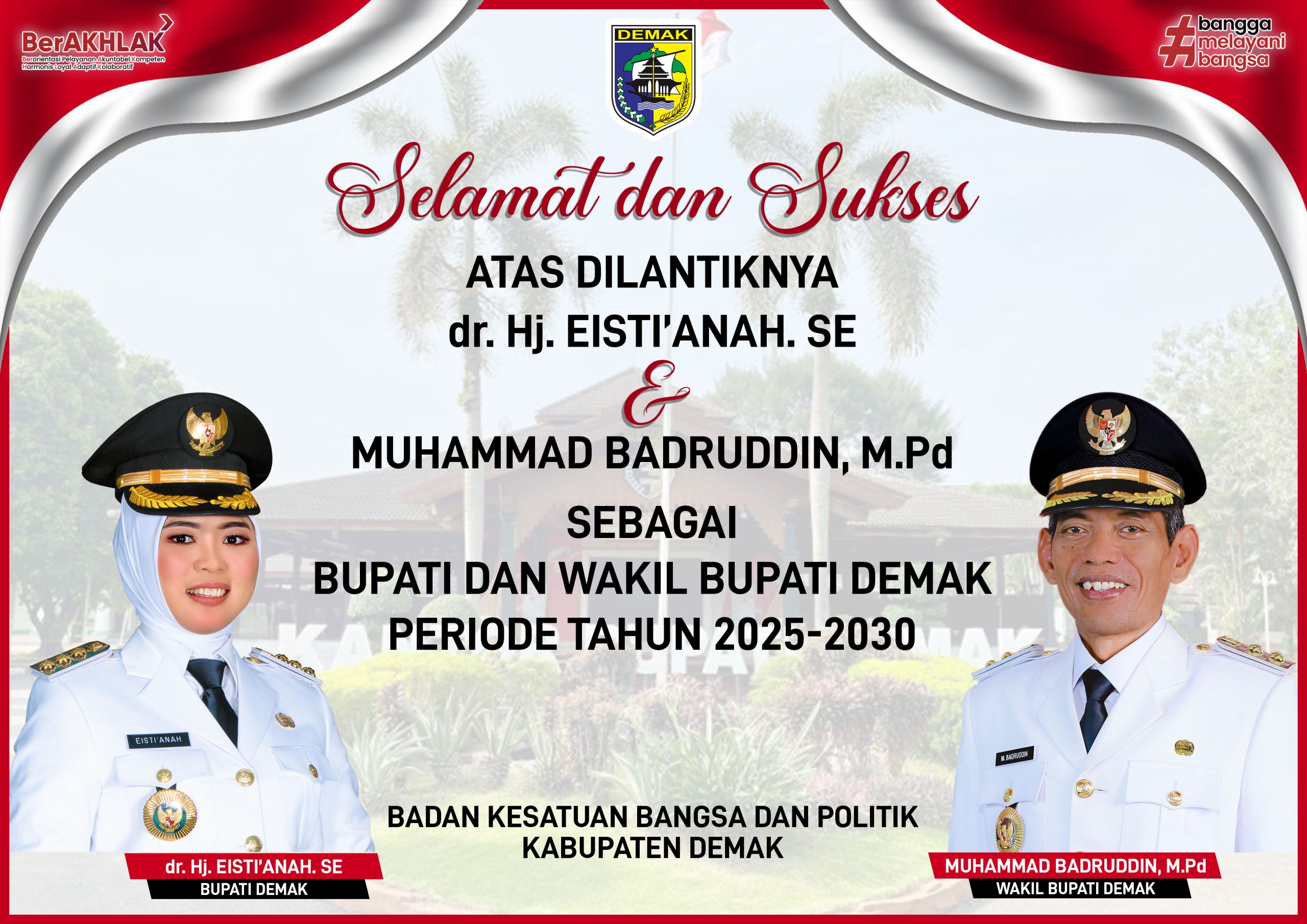 Kami Keluarga Besar Badan Kesatuan Bangsa dan Politik Kabupaten Demak mengucapkan selamat kepada Ibu dr. Hj. EISTI’ANAH. SE dan Bapak MUHAMMAD BADRUDDIN, M.Pd Sebagai Bupati Dan Wakil Bupati Demak Periode Tahun 2025-2030.